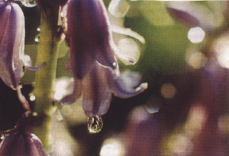 Hyacinty s kvapkami rosy, snímané v protisvetle. Ako obrys nejasne