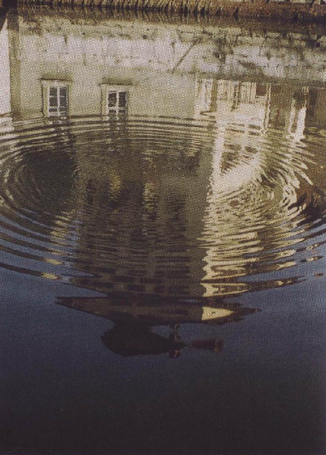 Zrkadlenie čela budovy pred jasným nebom vo vlniacej sa vodnej ploche. Obraz